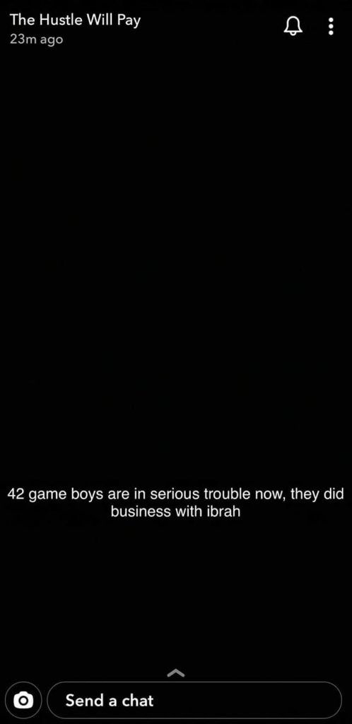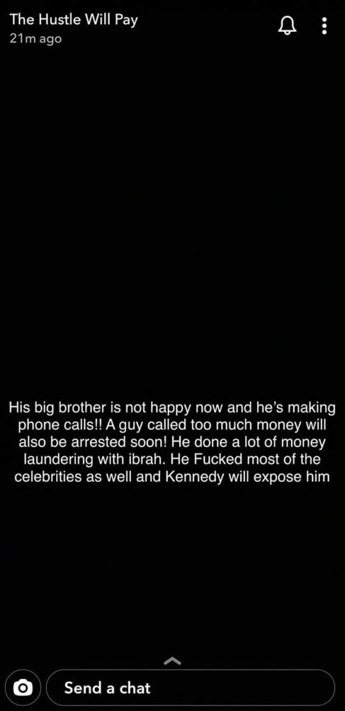 According to a snapchat post from Ibrah One he is giving Kennedy Agyapong 3 days Ultimatum of which he must use in apologizing else he and all his family members will die one after the other.